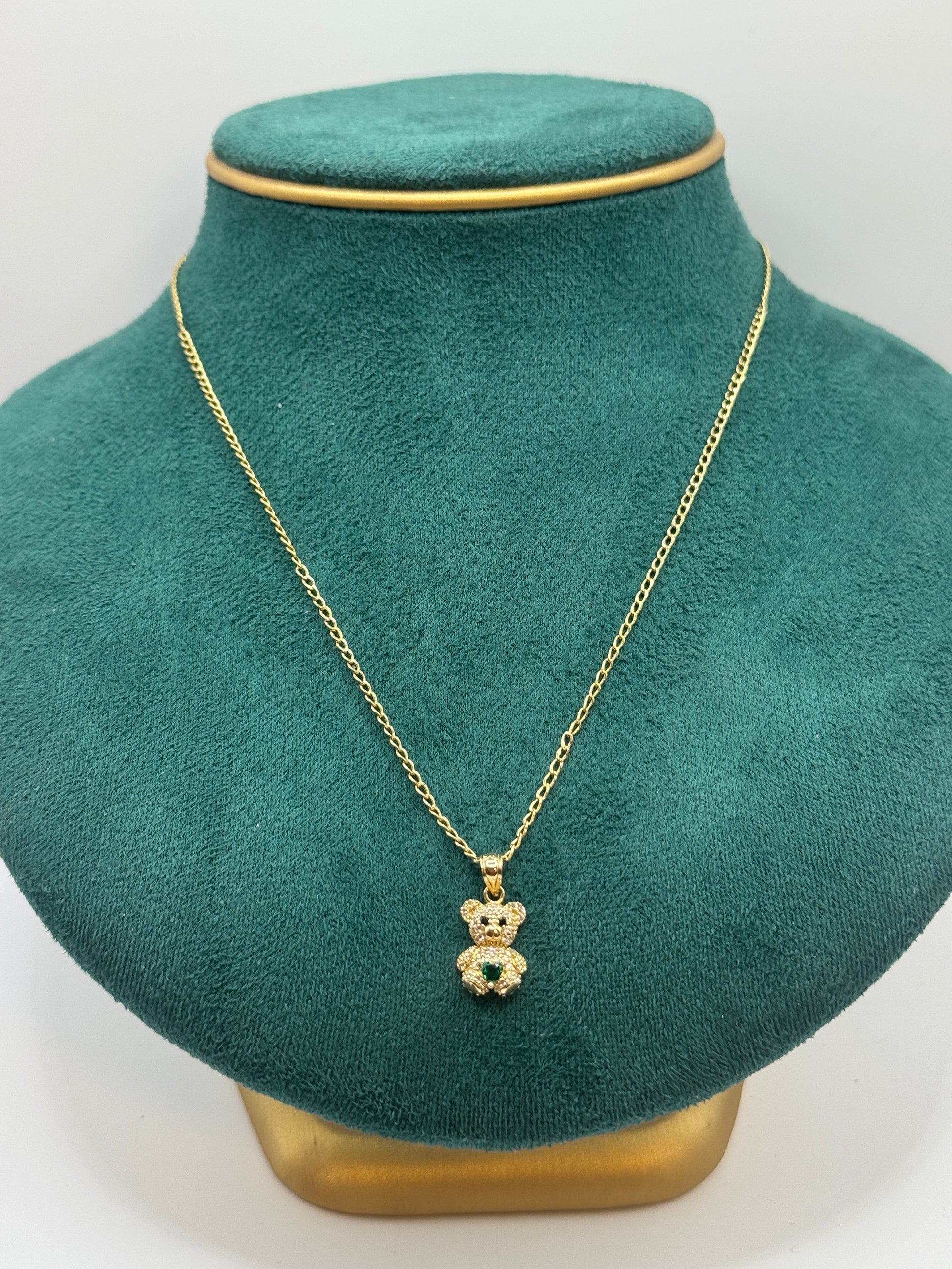π 14K 20β long Gold Curb Link Chain with Teddy Bear Pendant & Green Stone β Unisex