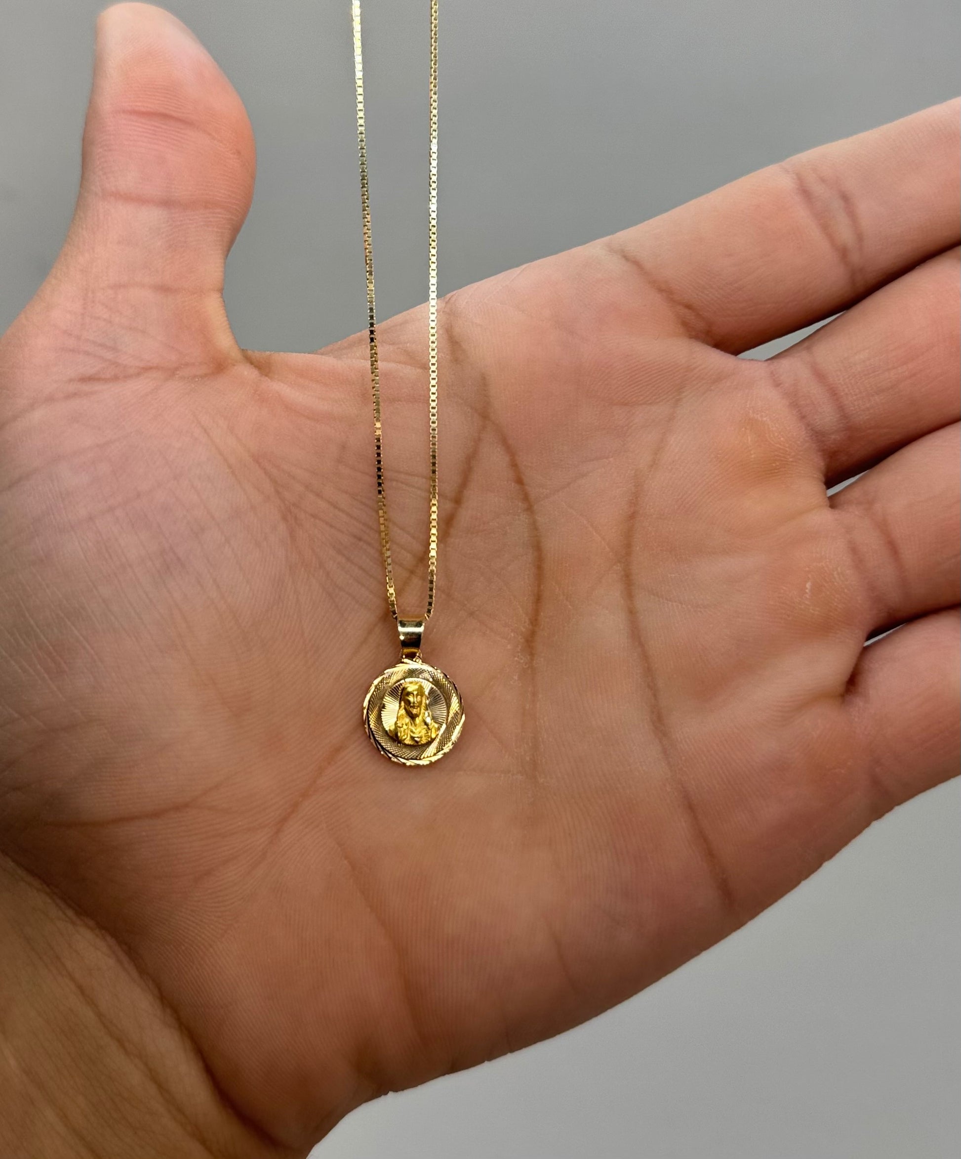 14k gold 16 inch box chain necklace with 2 sided pendant with Virgin Mary and Jesus Christ face for women