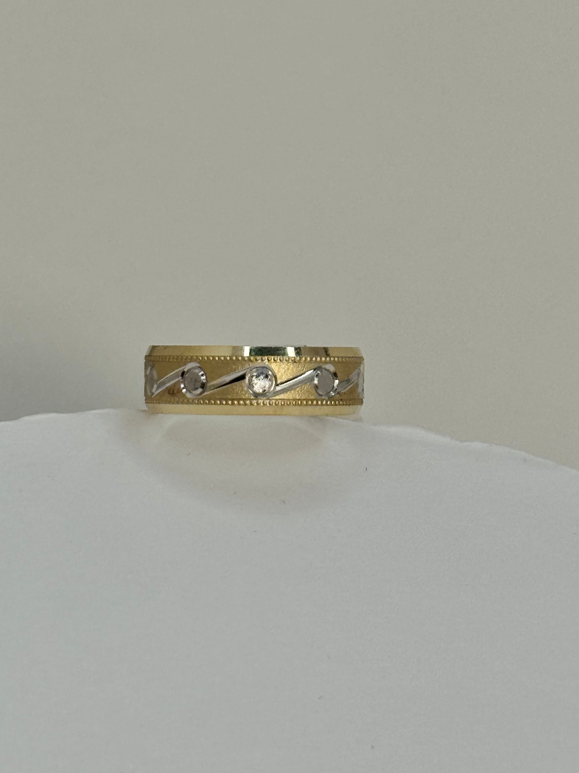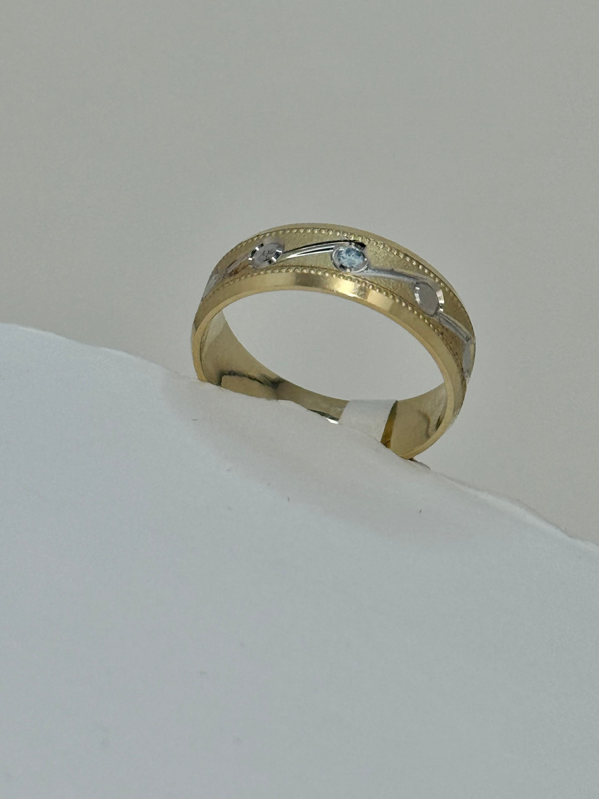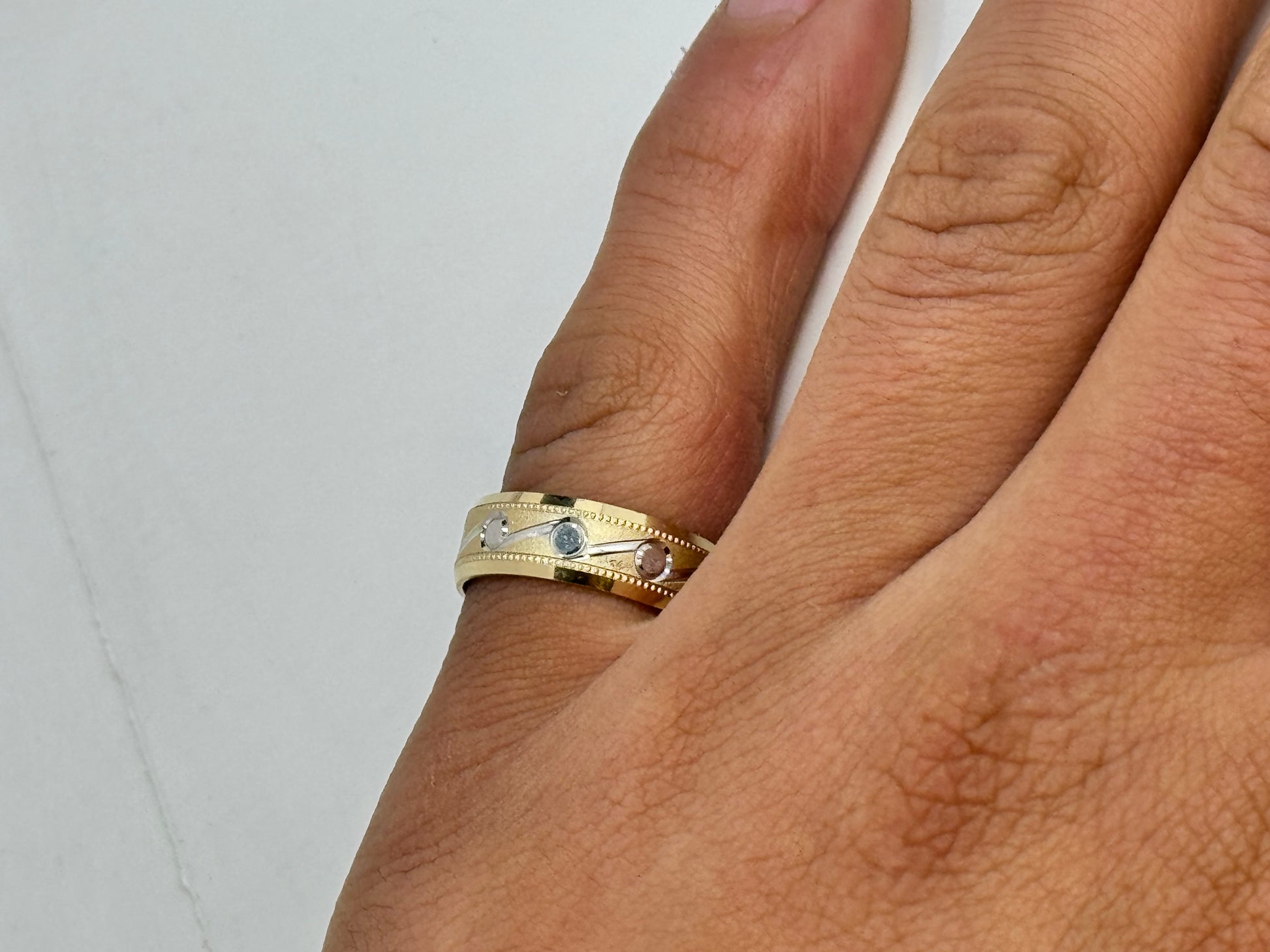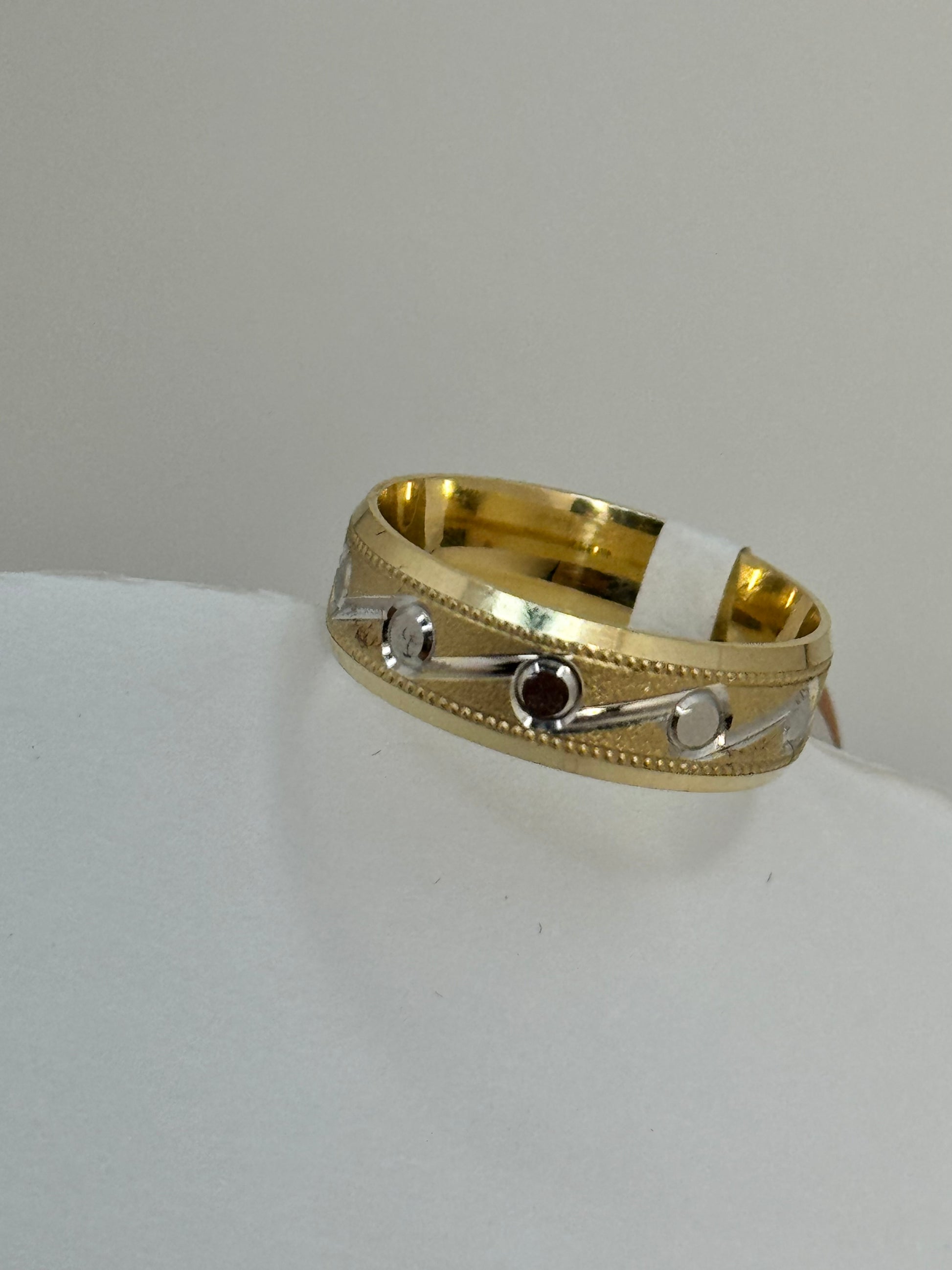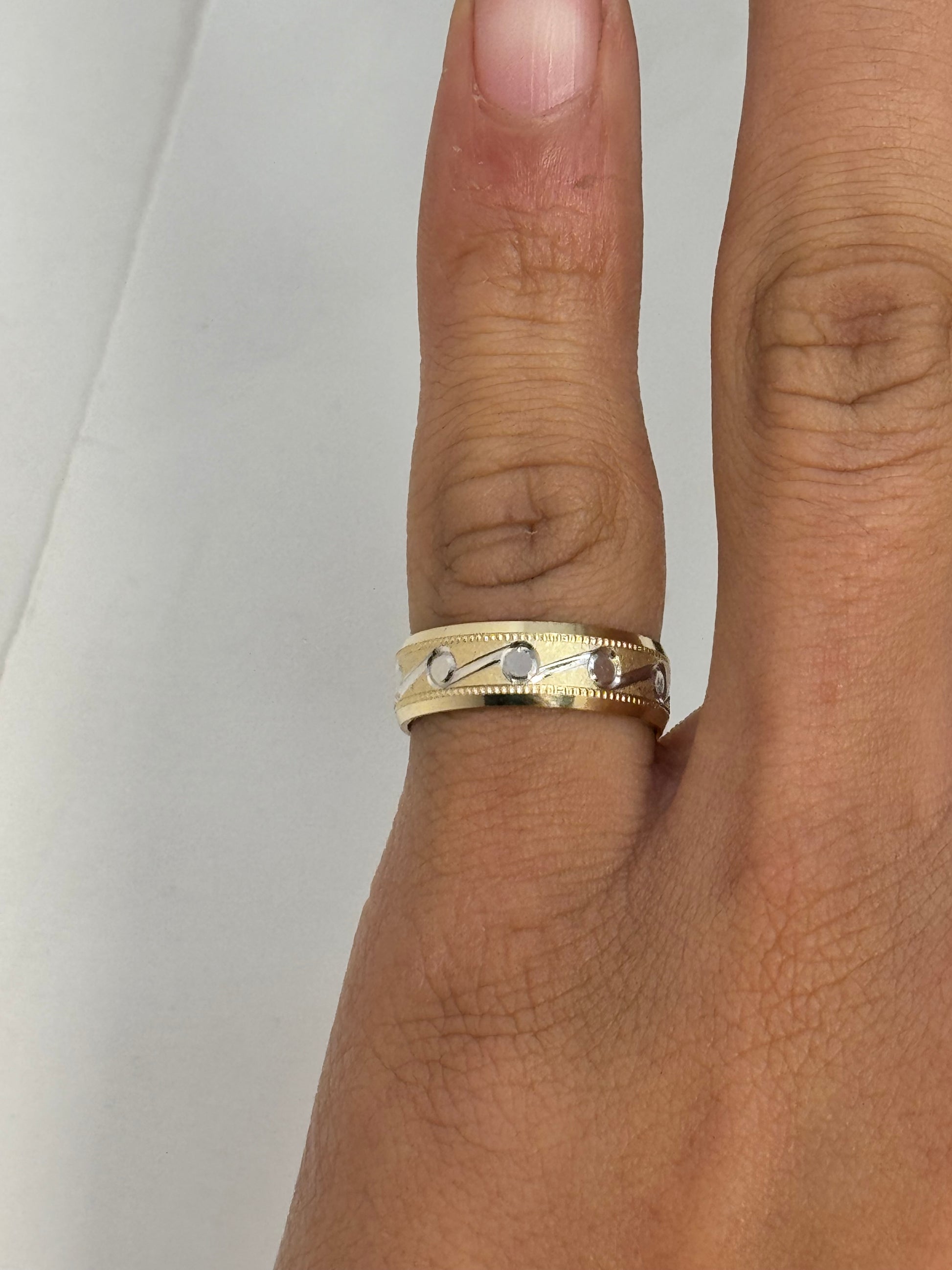 Crafted from solid 14k gold, this 2 tone wedding band exudes elegance and durability. The two-tone design offers a modern yet timeless look, making it perfect for any couple's special day. Its solid construction ensures long-lasting wear, making it a beautiful symbol of everlasting love.