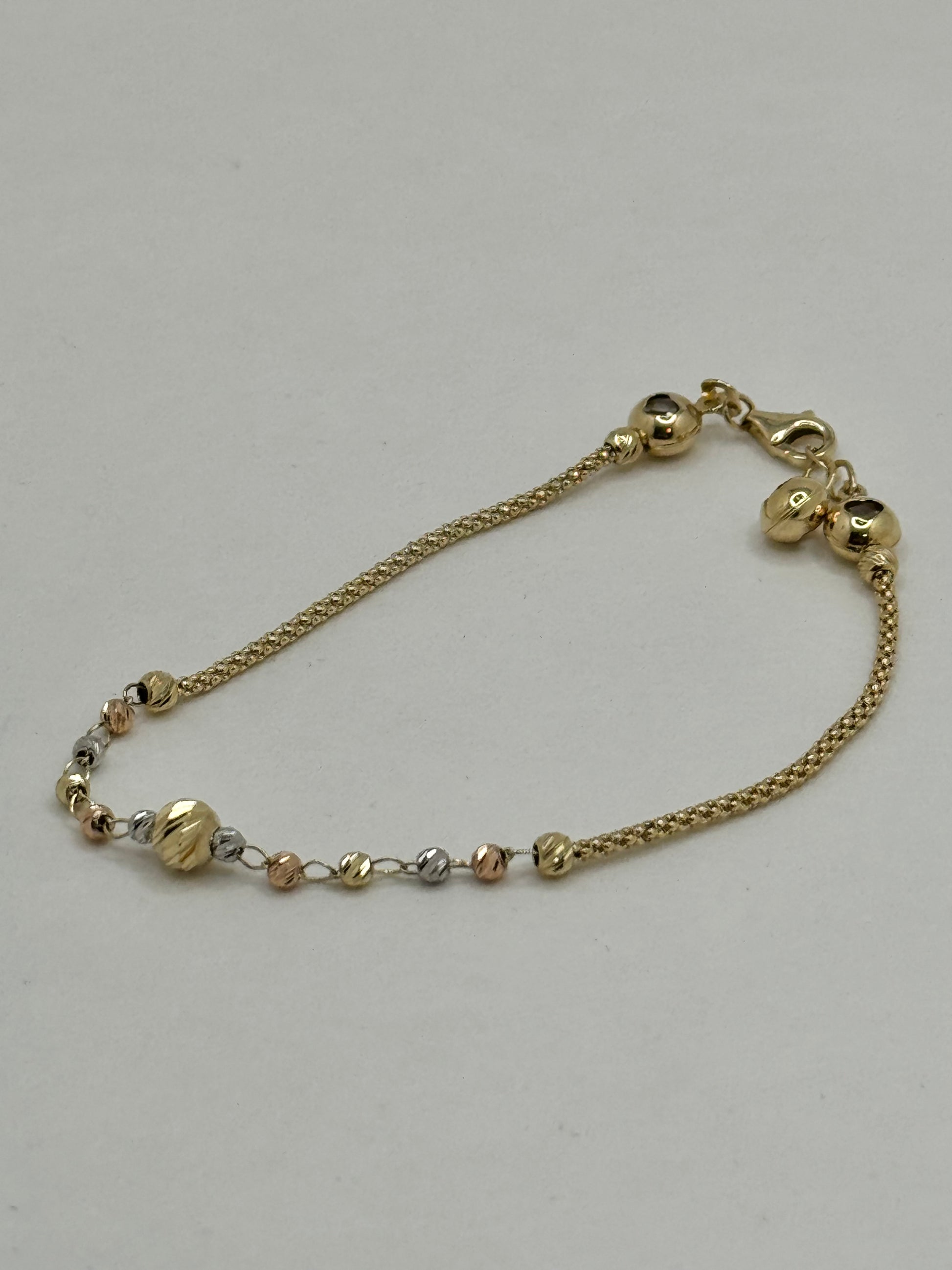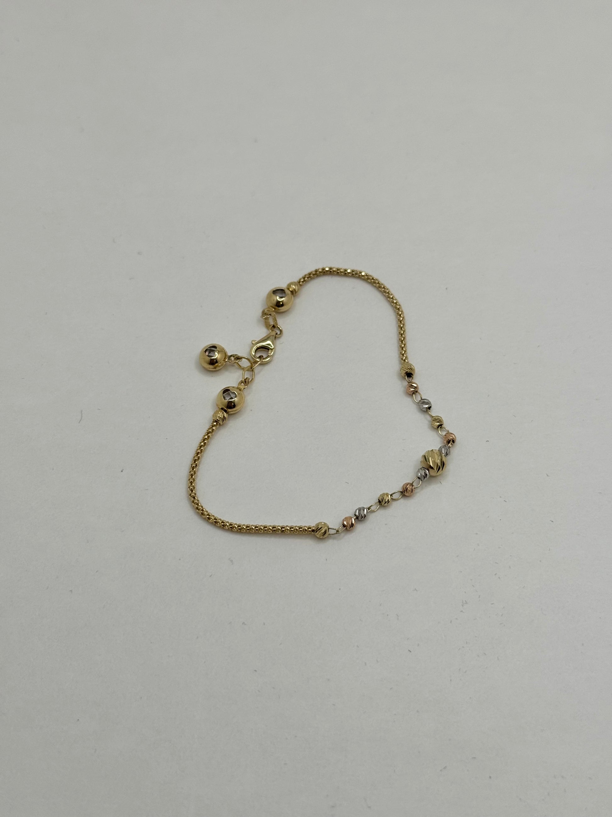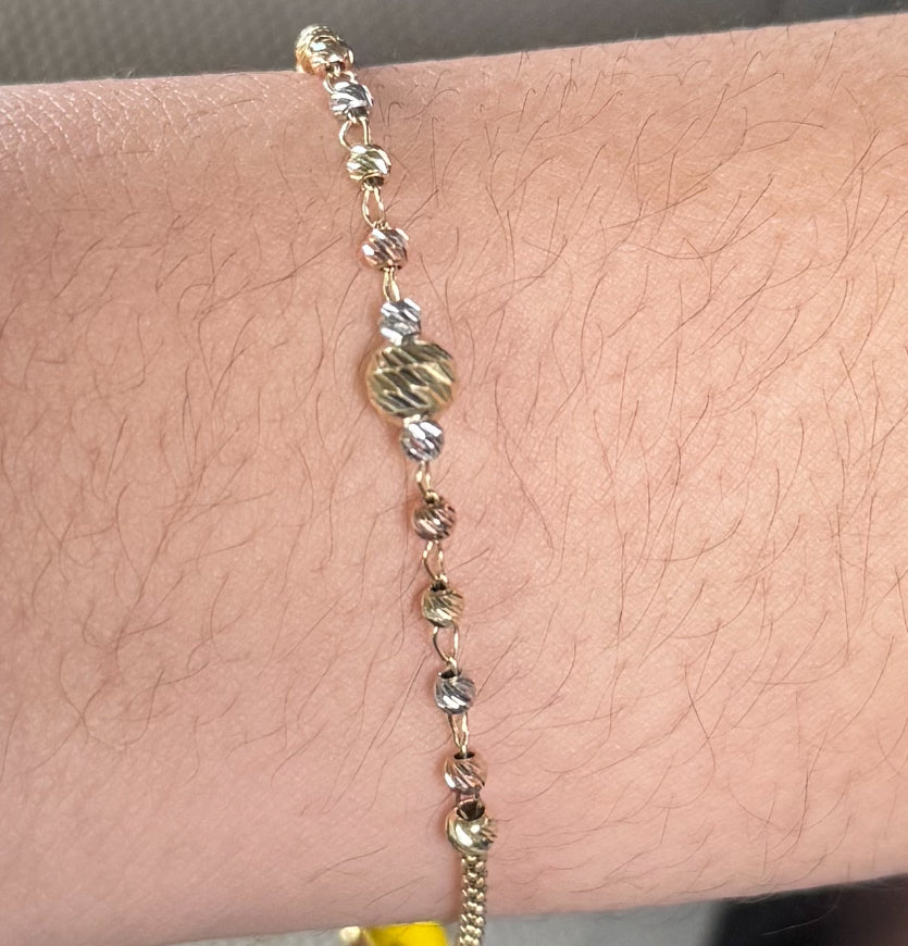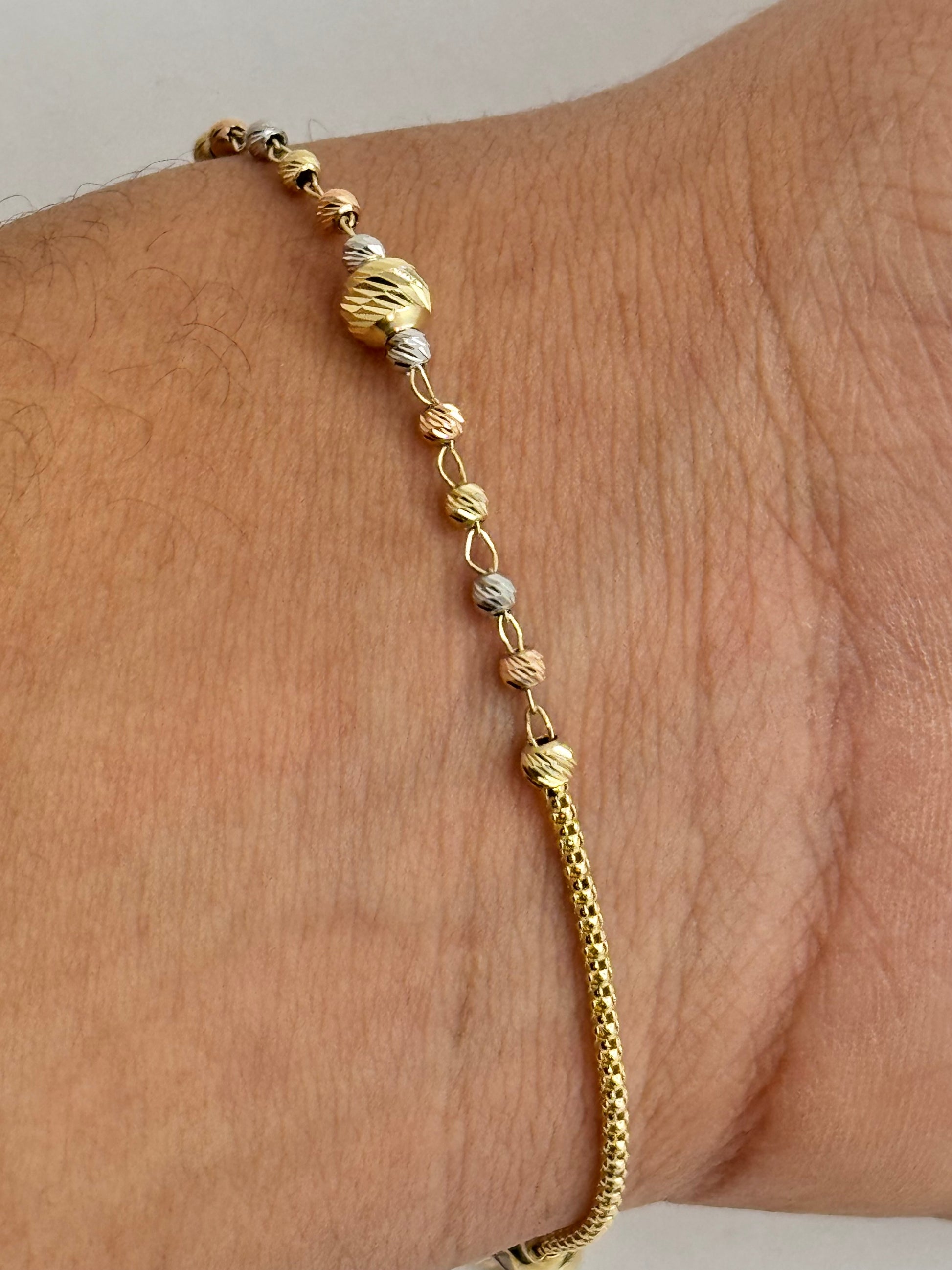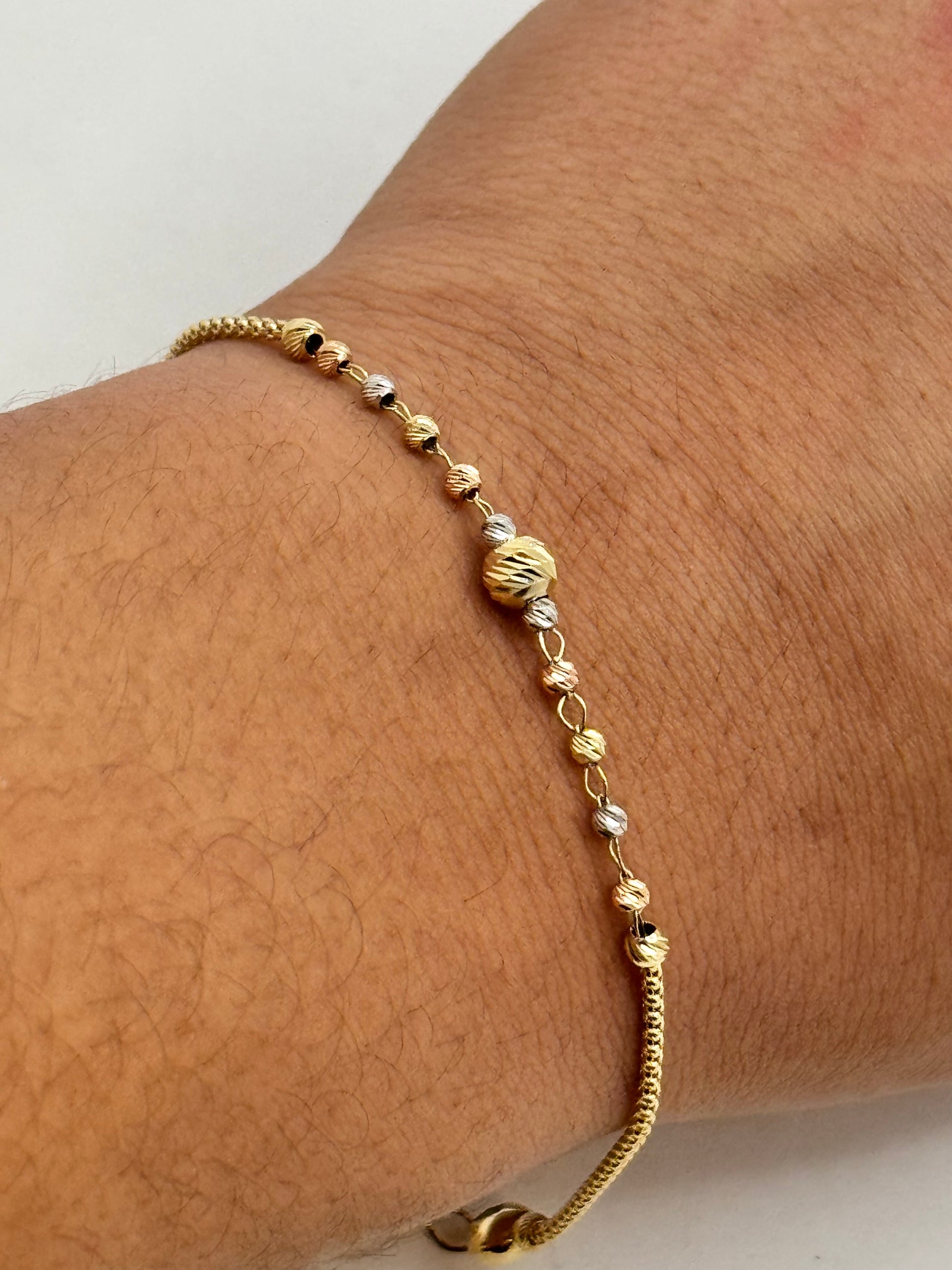 Crafted from 14k yellow gold, this 7-inch bracelet features elegant beaded stations along its length for a stunning and versatile accessory for women