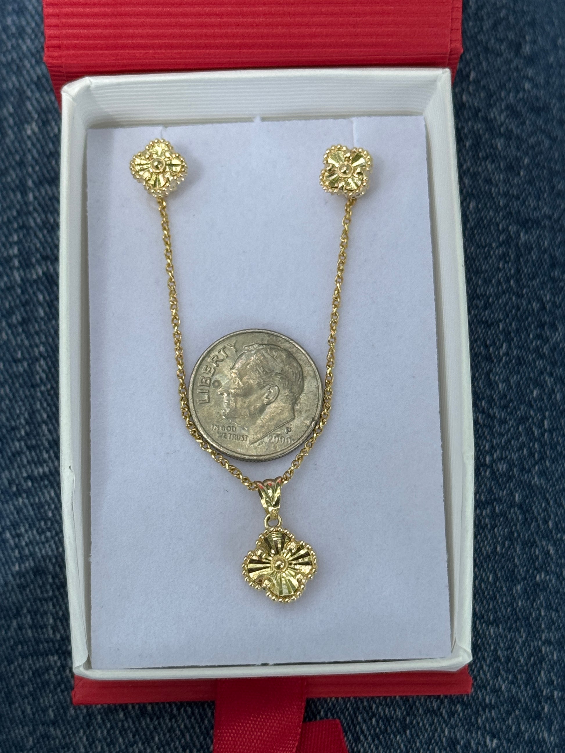 This beautifully matched bundle includes a solid 14K gold necklace and stud earrings, both featuring a delicate clover design – a symbol of luck, elegance, and charm. With detailed craftsmanship and radiant shine, this set is perfect for everyday luxury or meaningful gifting.