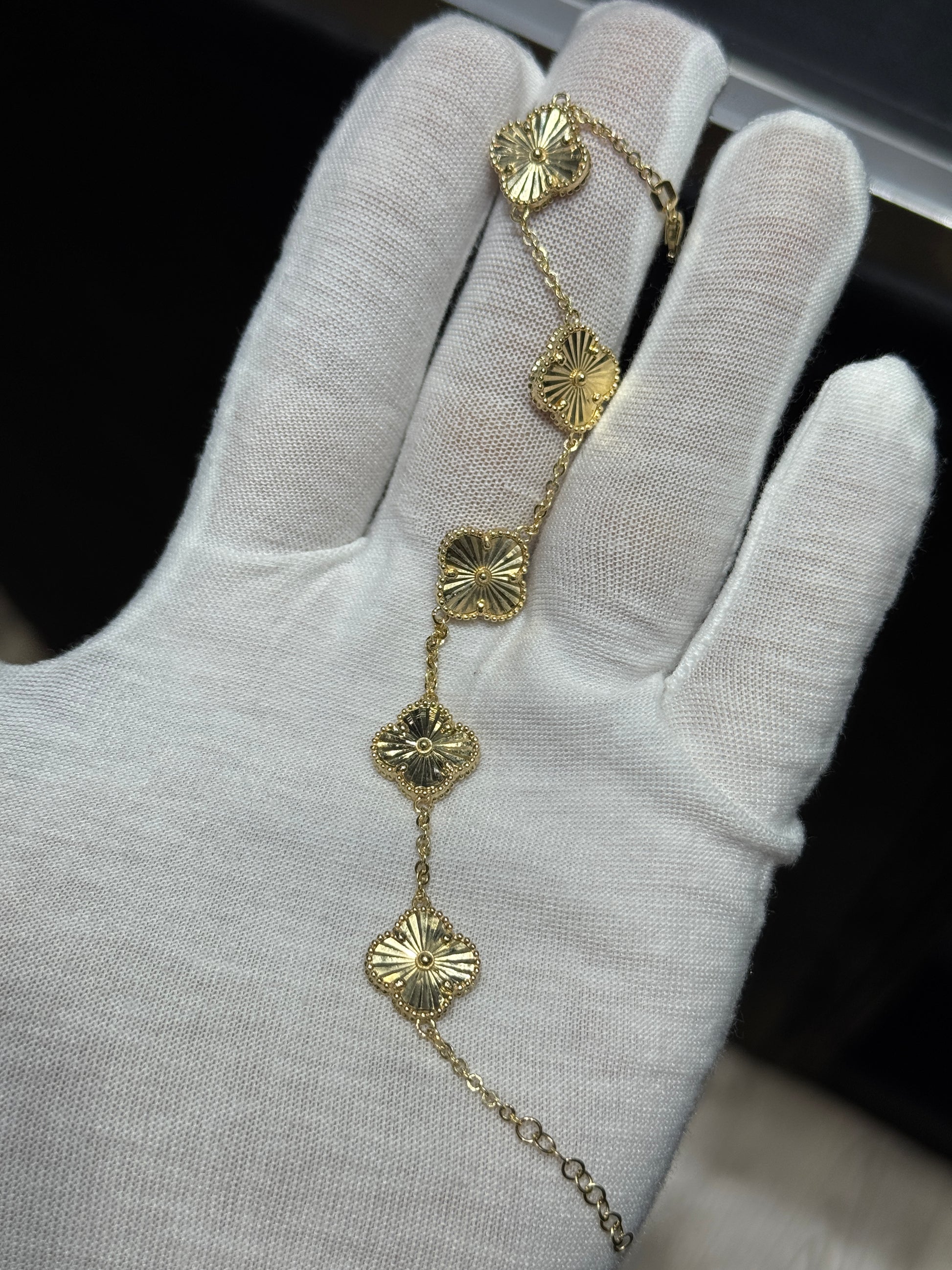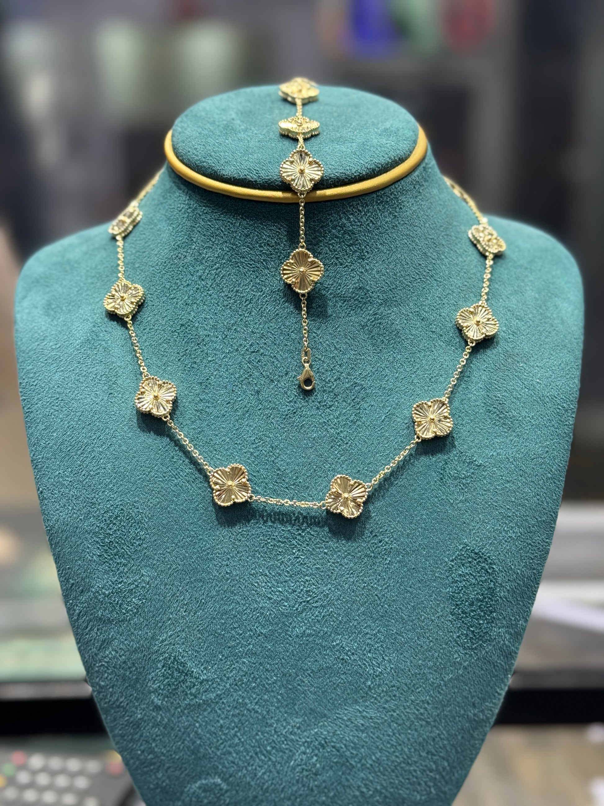 Elegant 14K gold clover bundle featuring a matching 18-inch necklace and 7.5-inch bracelet. Timeless clover design symbolizing luck, beauty, and prosperity — a perfect luxury set for everyday wear or gifting.
