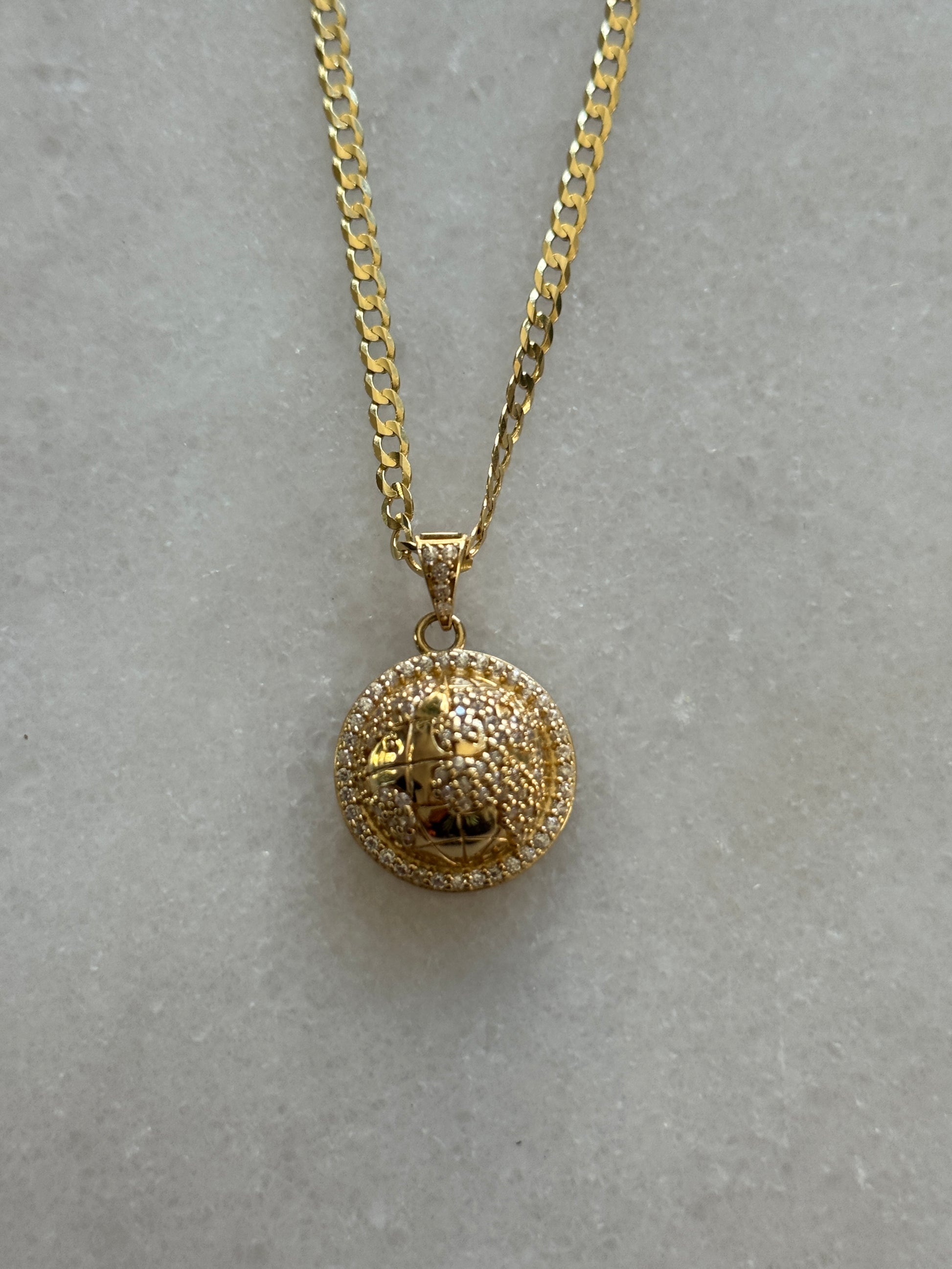 14K Gold Curb Link Chain with World Pendant โ 22โ
