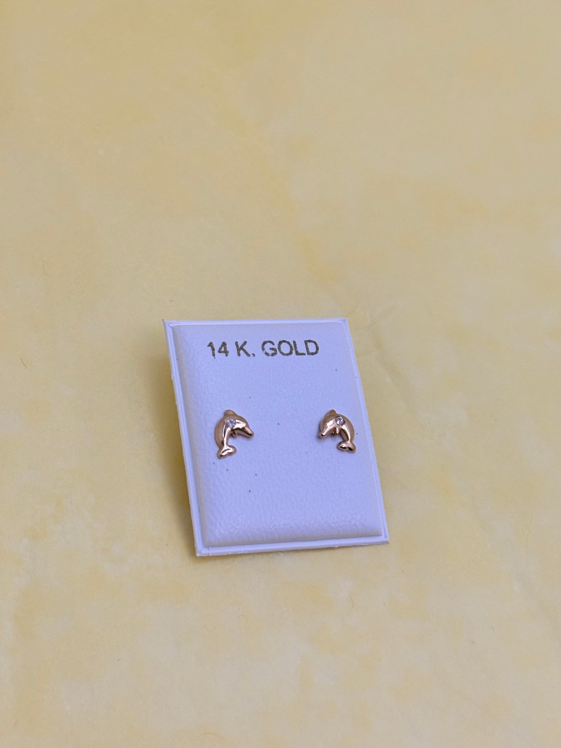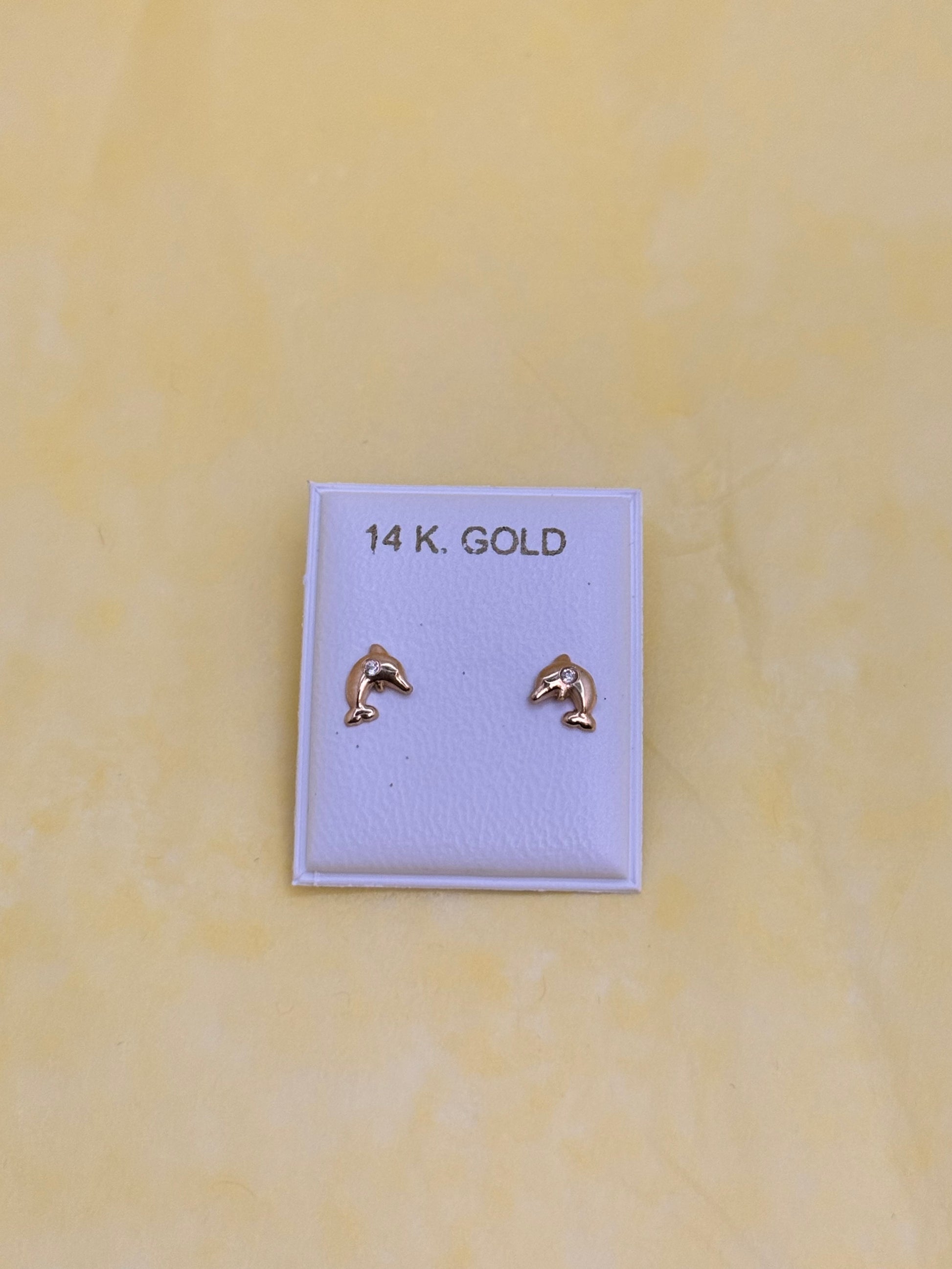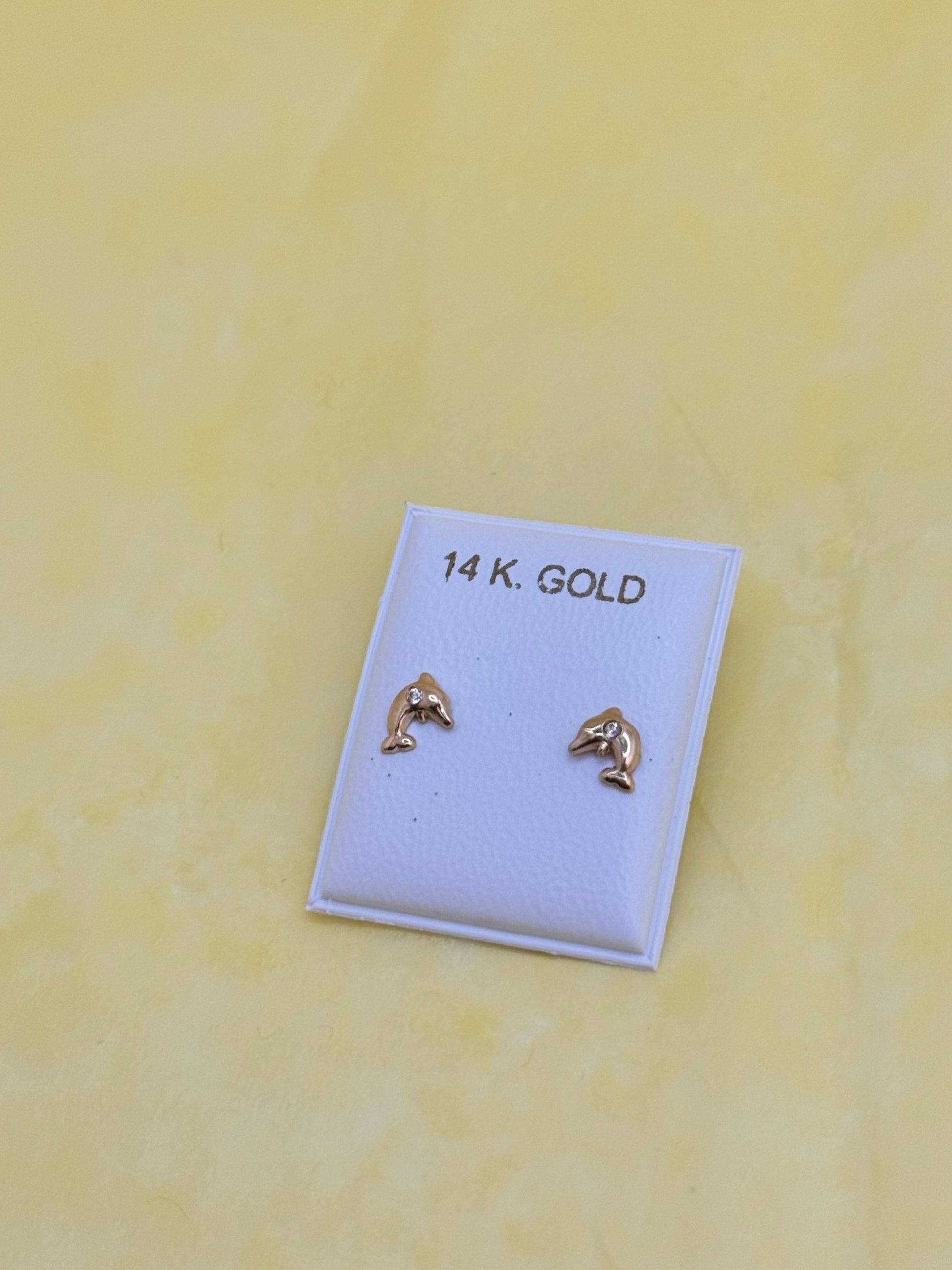 14k Gold Dolphins Stud earrings with Cubic zirconia Expertly crafted with 14k gold and adorned with a glistening cubic zirconia stone, these dolphins stud earrings add a touch of elegance and glamour to any outfit. The perfect accessory for those who appreciate fine jewelry and want to make a statement with their style.