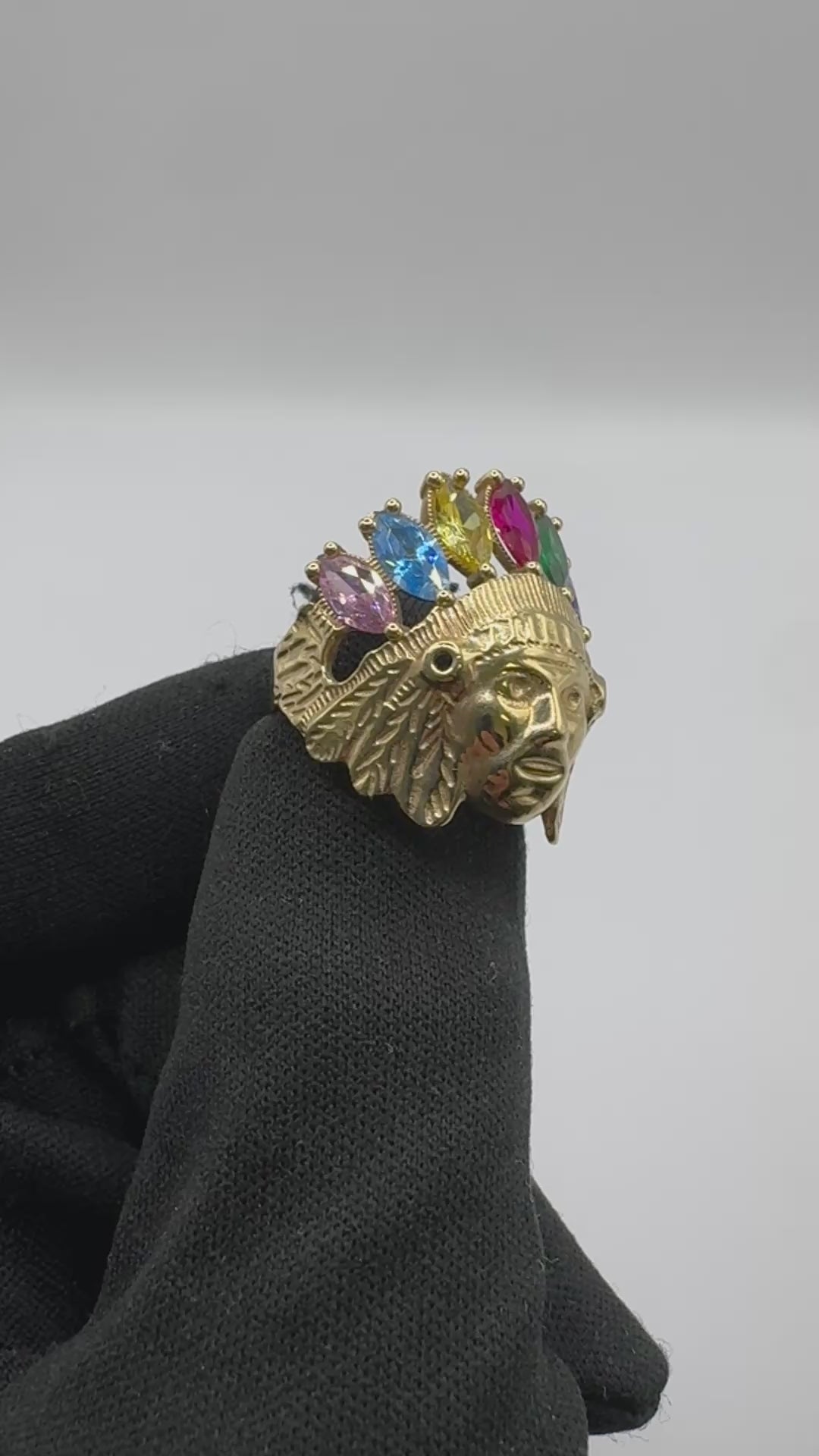 Luxury 14K gold Indian-style ring featuring a detailed head design set with multiple stones, creating a bold, cultural, and powerful statement piece. Rich in symbolism, craftsmanship, and luxury presence — perfect for collectors and standout style.