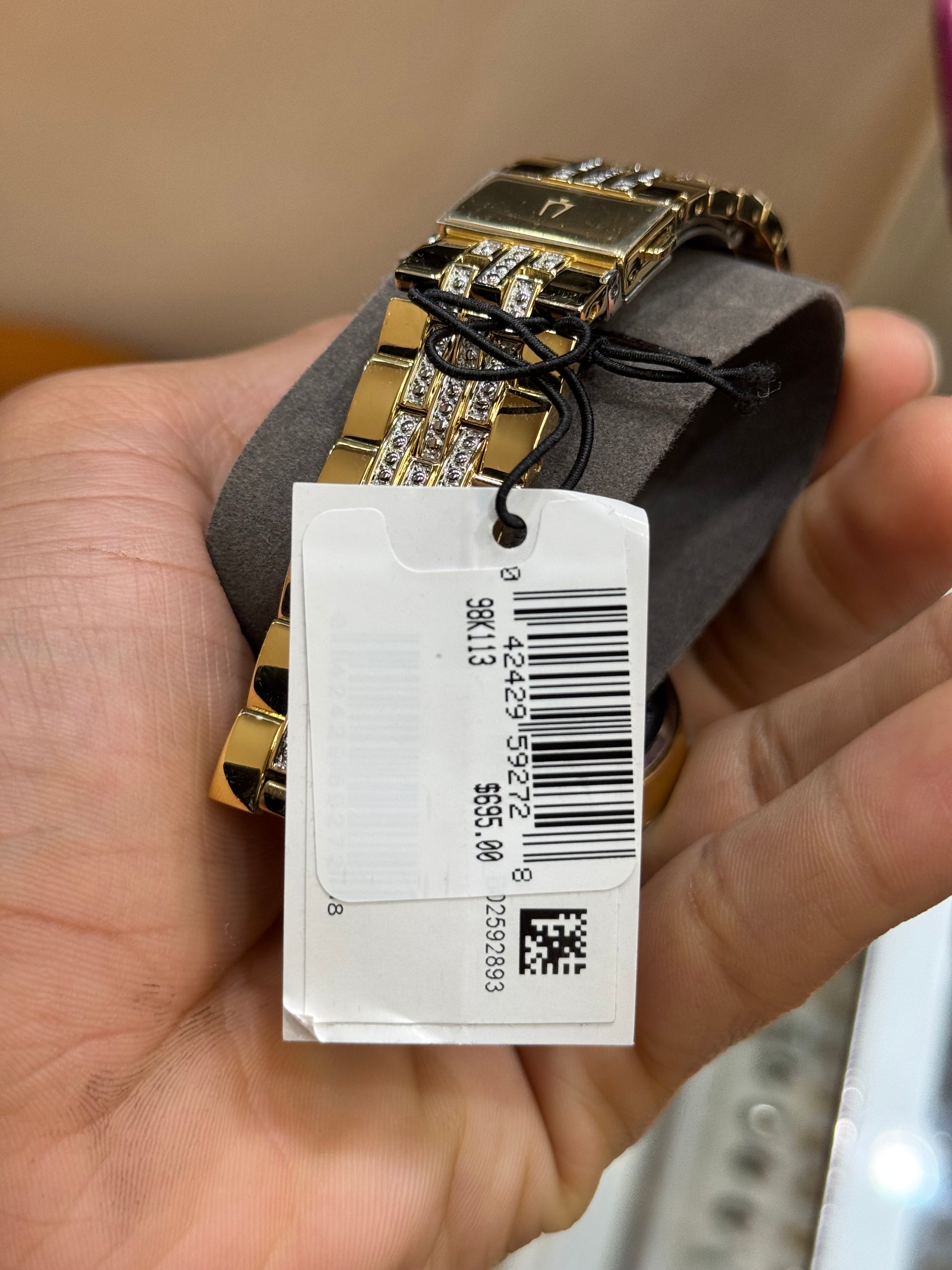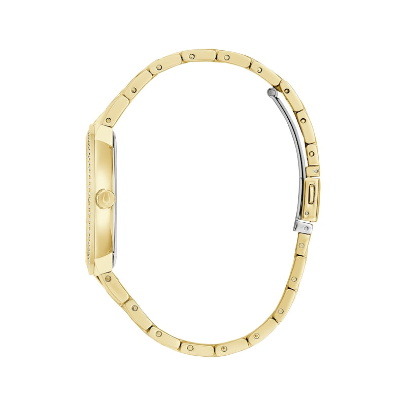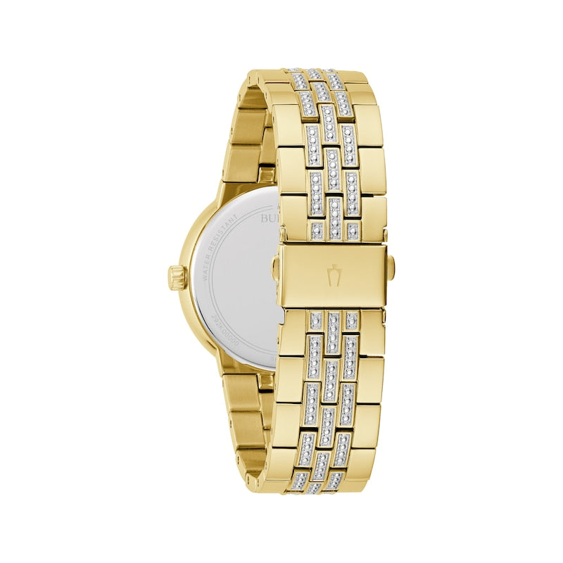 • Sparkling clear crystals on the gold-tone stainless steel bracelet, bezel, and champagne dial.