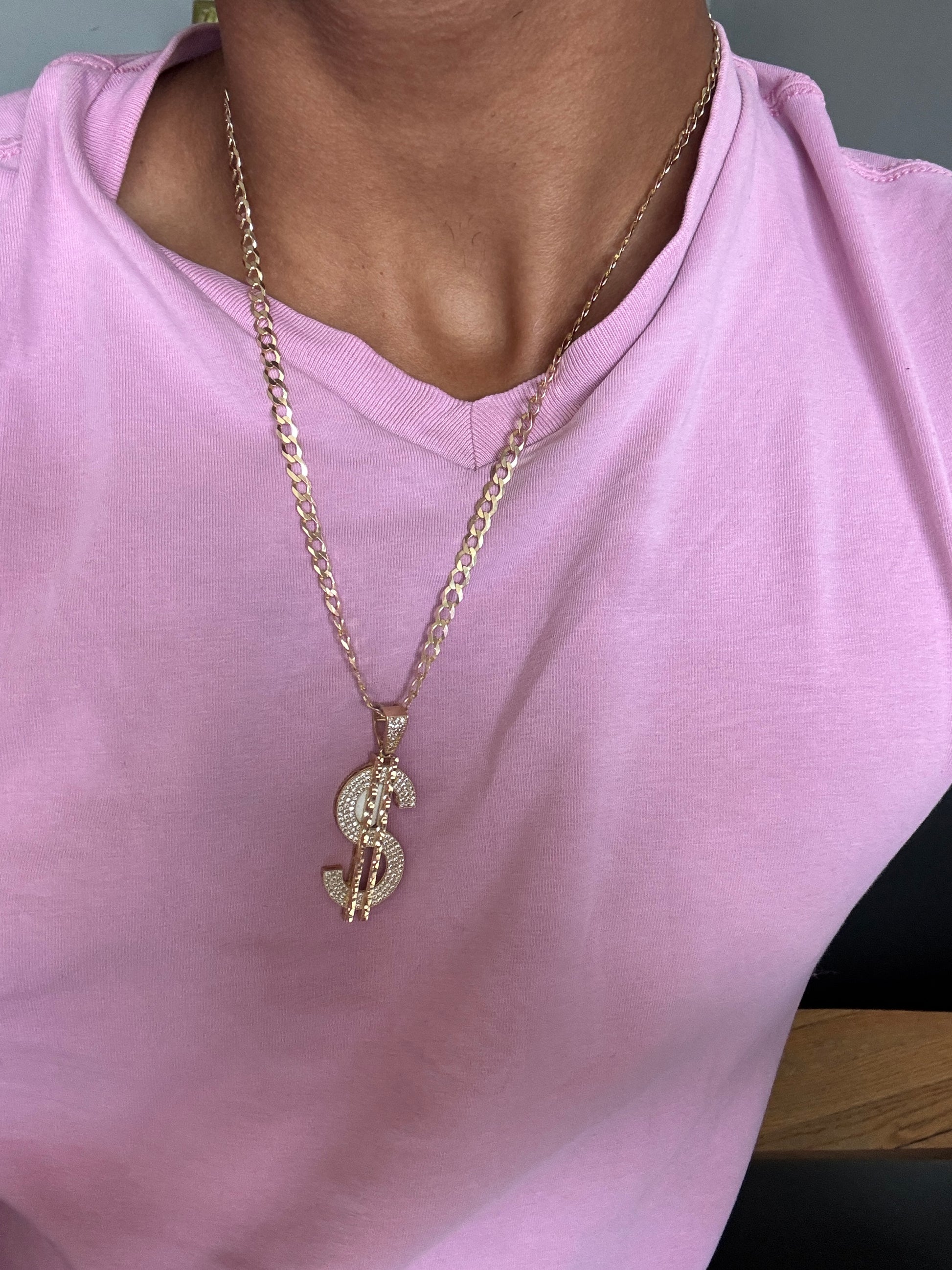 ✨ Sleek 14K gold curb link chain paired with a stylish dollar sign pendant, perfect for those who love to stand out with confidence and style.