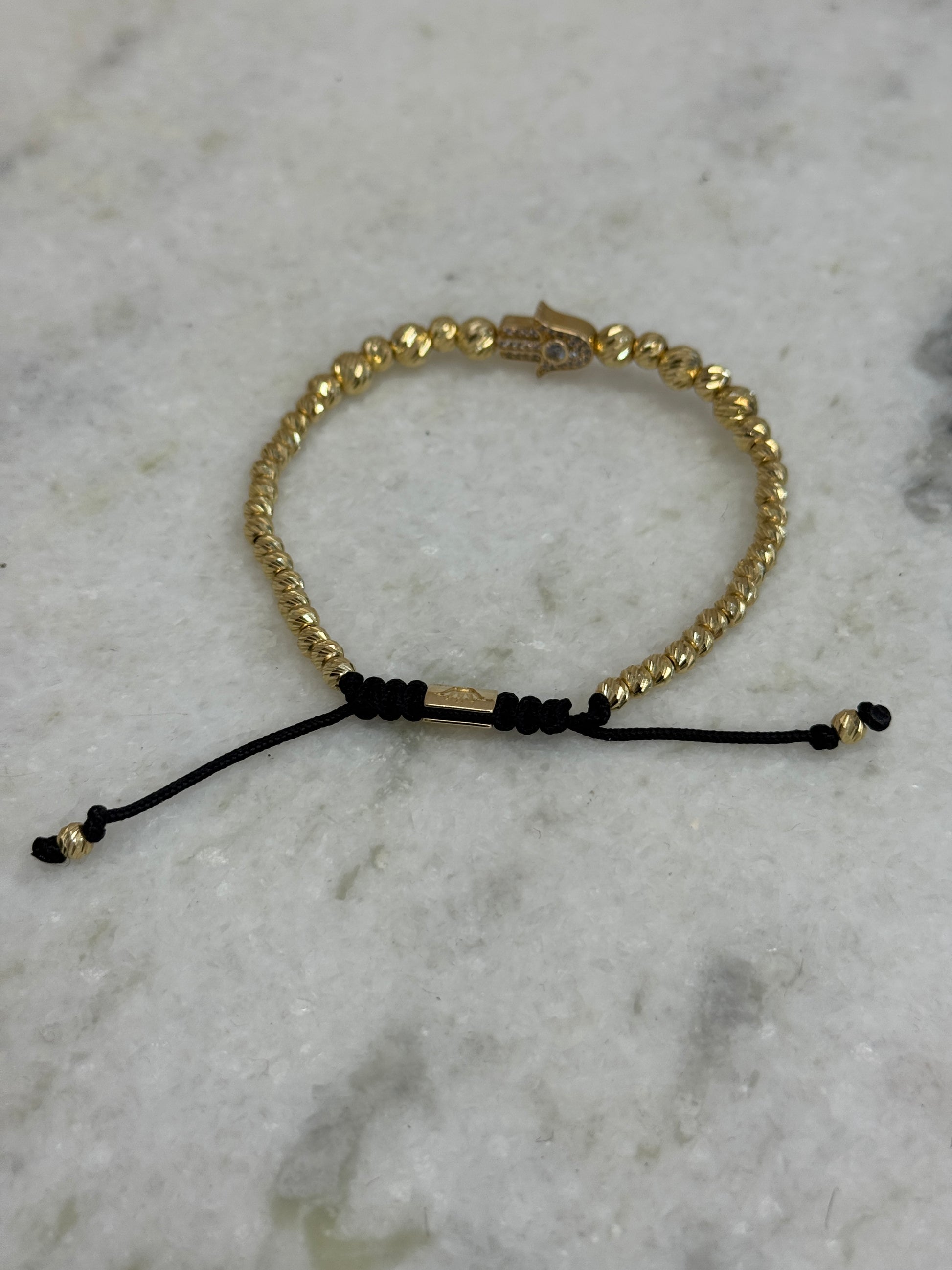 A sleek unisex bracelet featuring polished 14k gold beads and a protective Hamsa charm, perfect for daily wear or gifting.