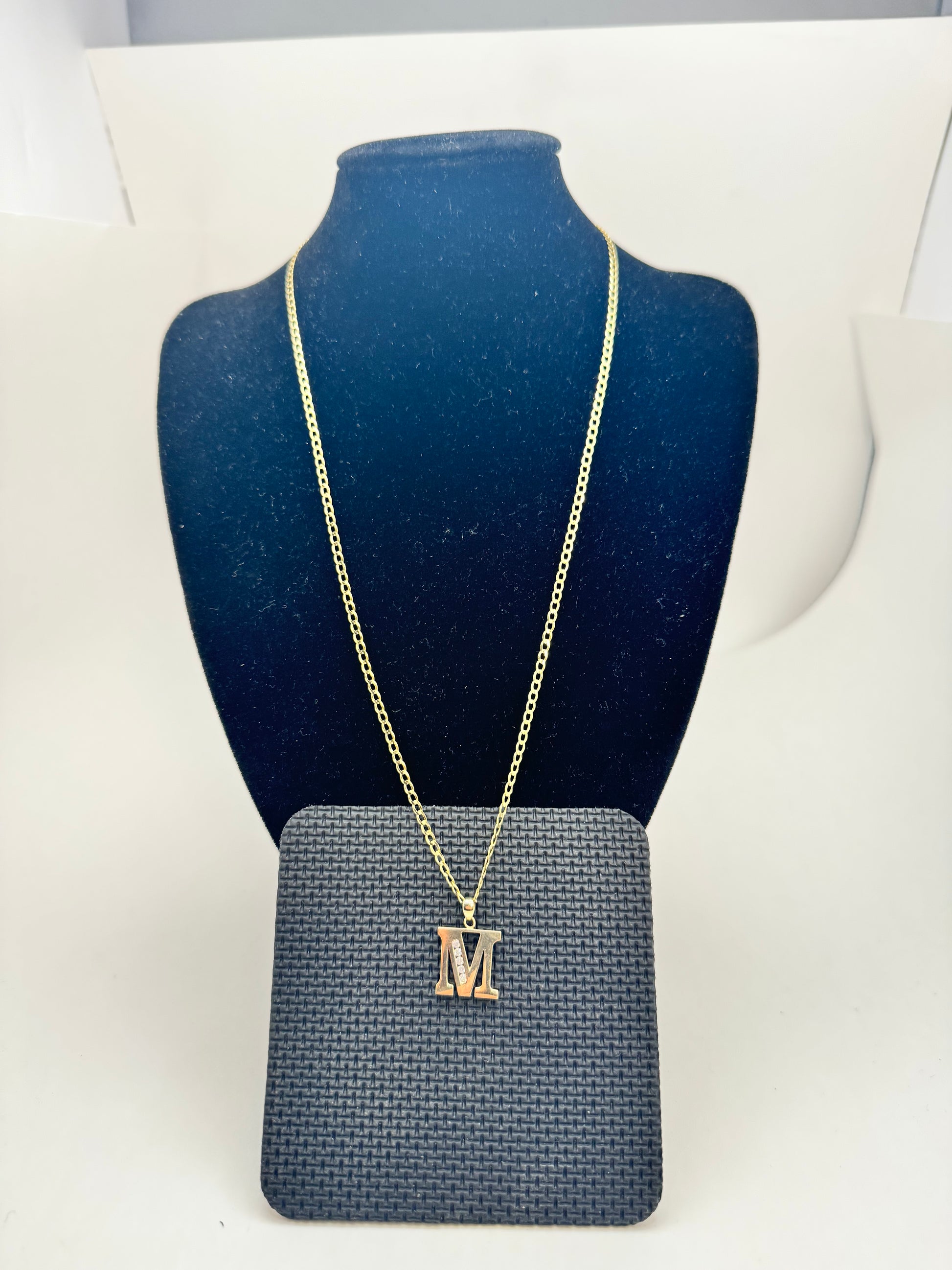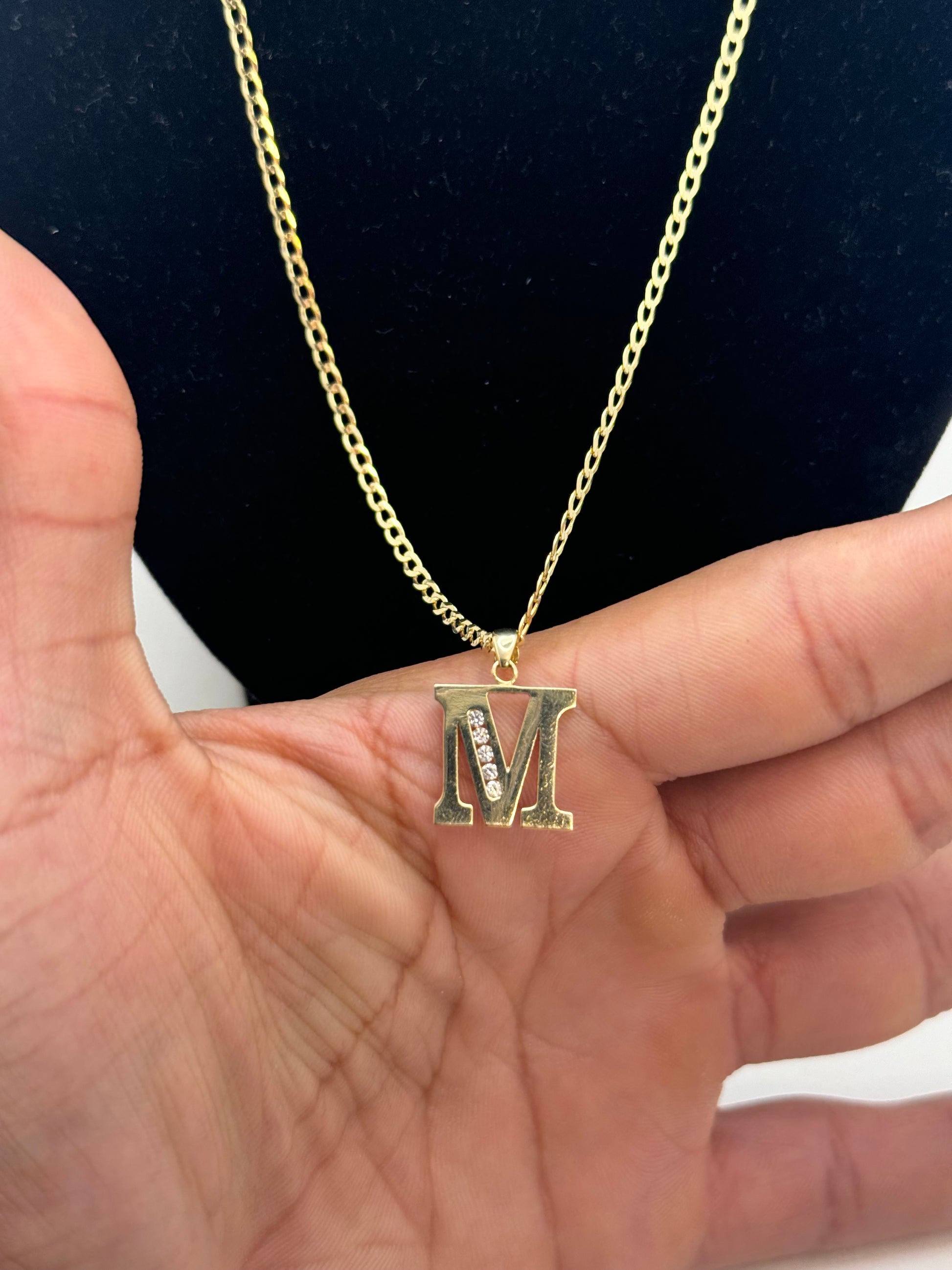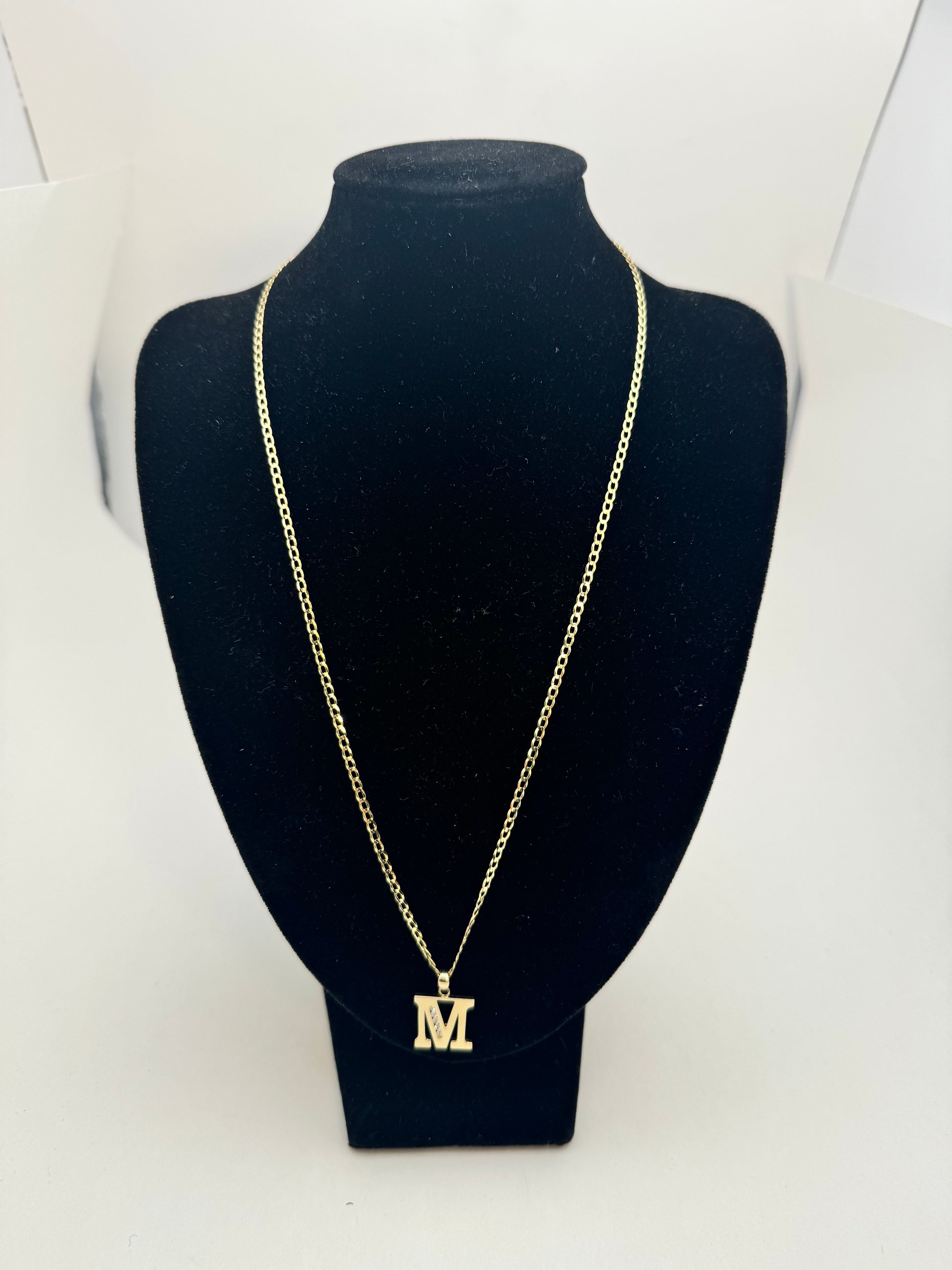 14 karat gold Cuban link chain with M pendant, yellow gold